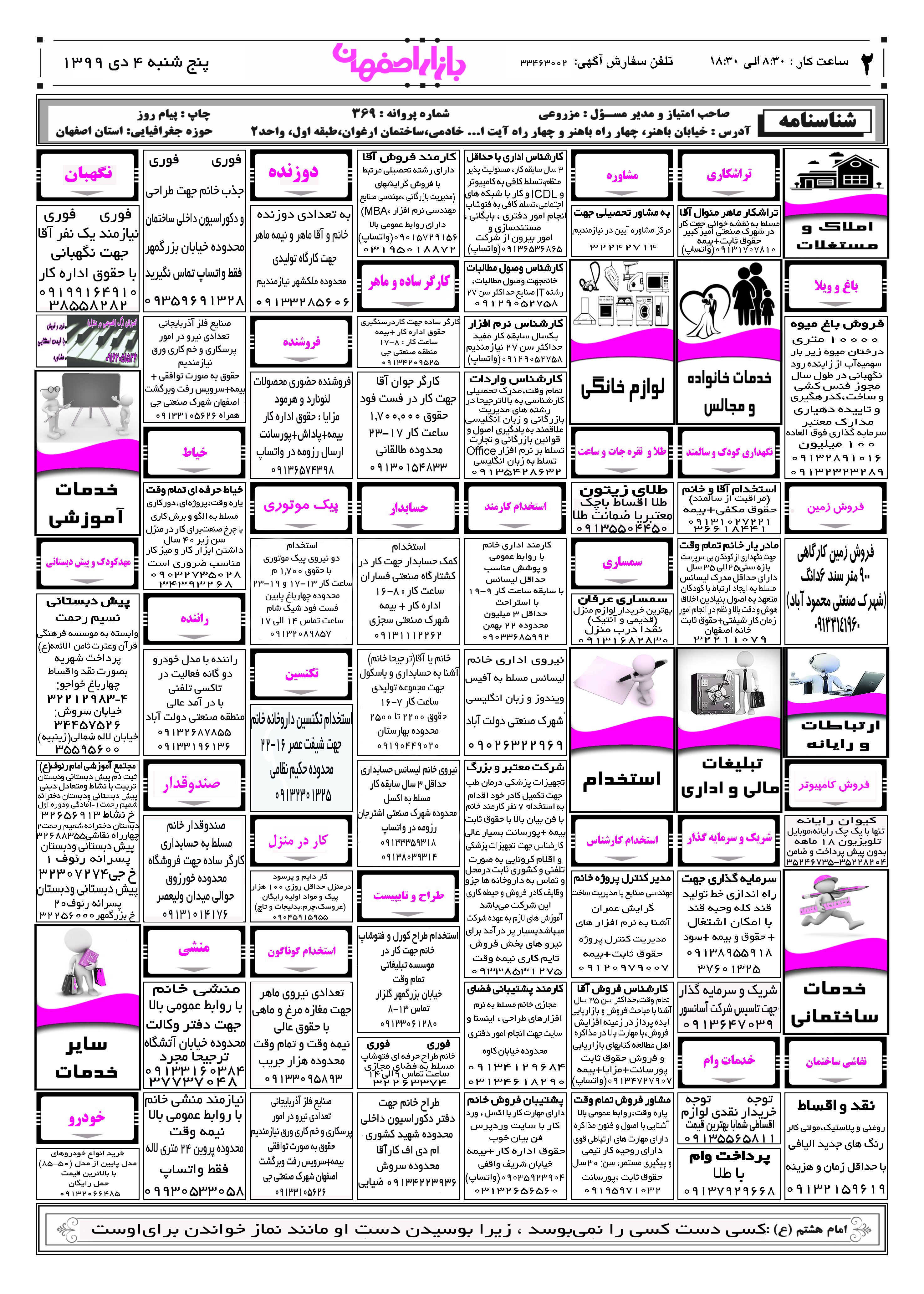 1399/10/04 صفحه اول نيازمندی بازار اصفهان در تاریخ 1399/10/04 صفحه دوم نيازمندی بازار اصفهان در تاریخ 1399/10/04 صفحه سوم نيازمندی بازار اصفهان در تاریخ 1399/10/04 صفحه آخر نيازمندی بازار اصفهان در تاریخ 1399/10/04