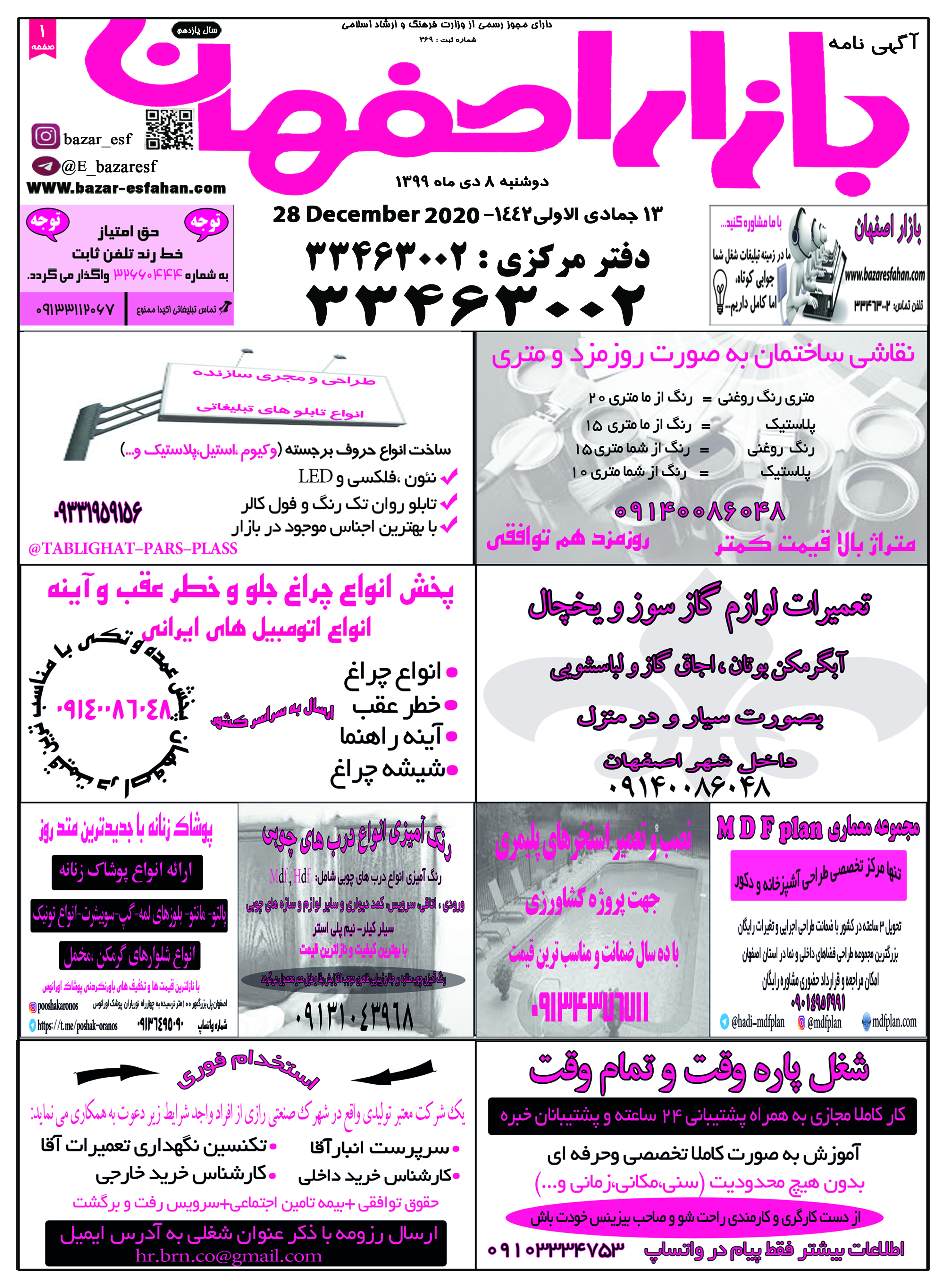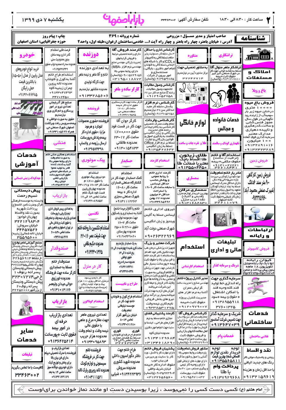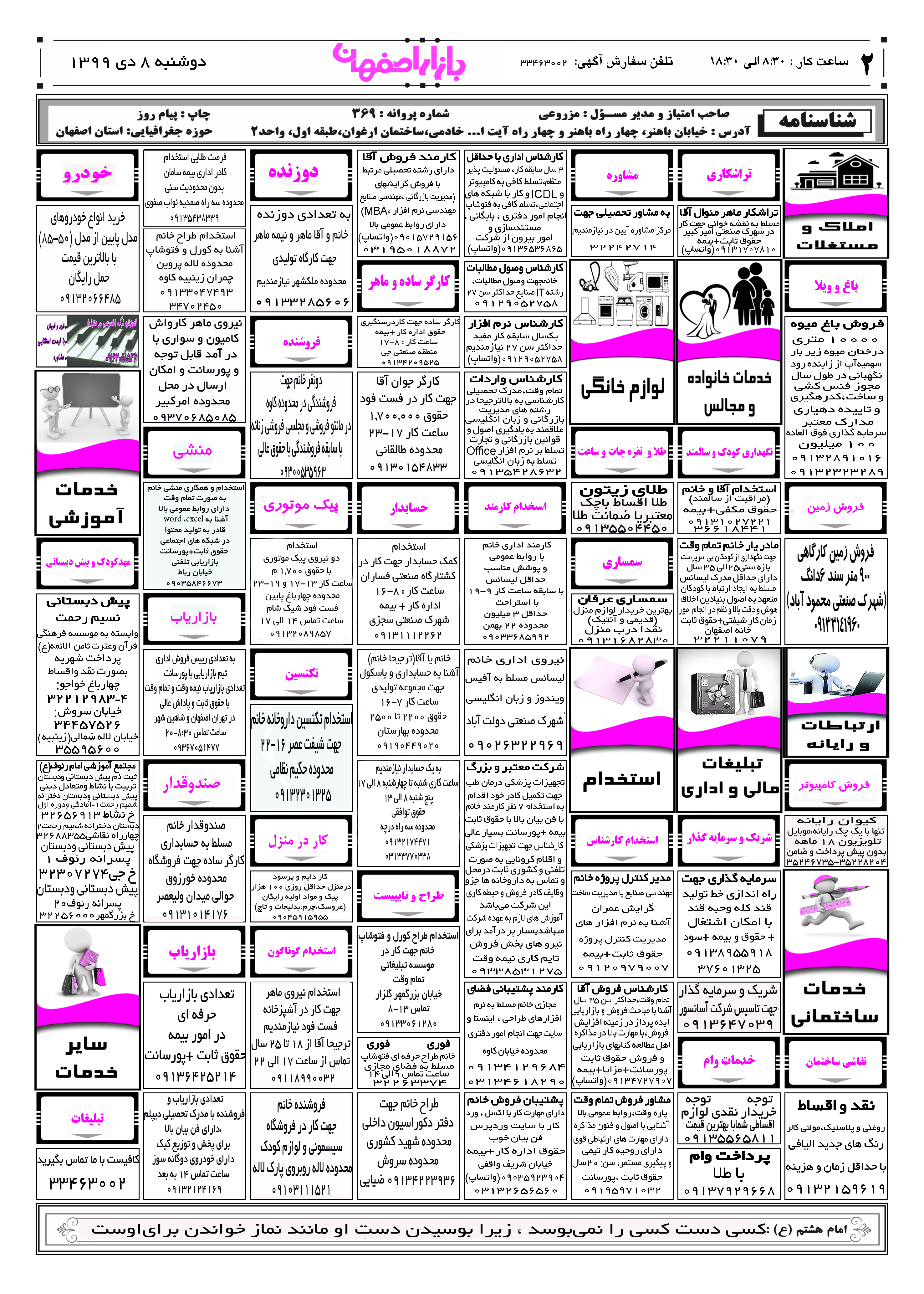 1399/10/08 صفحه اول نيازمندی بازار اصفهان در تاریخ 1399/10/08 صفحه دوم نيازمندی بازار اصفهان در تاریخ 1399/10/08 صفحه سوم نيازمندی بازار اصفهان در تاریخ 1399/10/08 صفحه آخر نيازمندی بازار اصفهان در تاریخ 1399/10/08